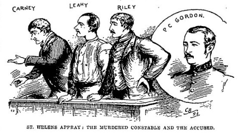 John CARNEY, aged 19, John LEAHEY, aged 22, and Frank RILEY, aged 32, collier, who are charged with the wilful murder of Police-constable James GORDON on the 12th November at St Helens. There was a second indictment against the prisoners for poultry stealing from the foundry of John FOSTER at St Helens. Mr J. F. LEECE, Q.C, M.P, and Mr DEVEY conducted the case for the prosecution, the prisoners were defended by Dr COMMINS, M.P.