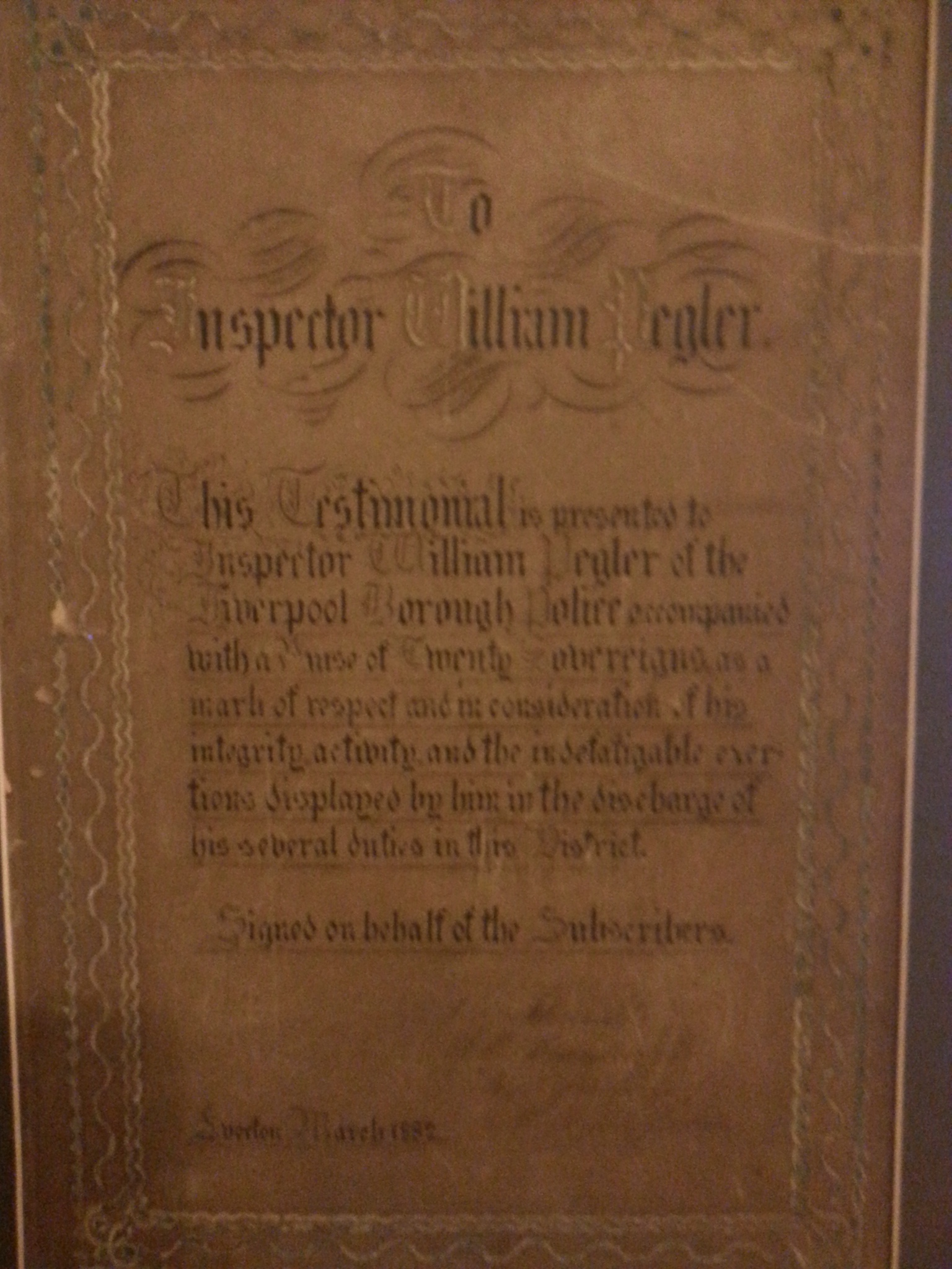 By 1891, for reasons unknown, William PEGLER has left the police force and the Liverpool area and in 1891, is living in Faulkner St, Barton, Gloucester, with his wife and children [born Liverpool] his occupation is down as "Retired Master Mariner", he is still in the same street and area in 1901, now a widow, with children Esther 20, and Victor 13, his occupation, carpenter. ???????