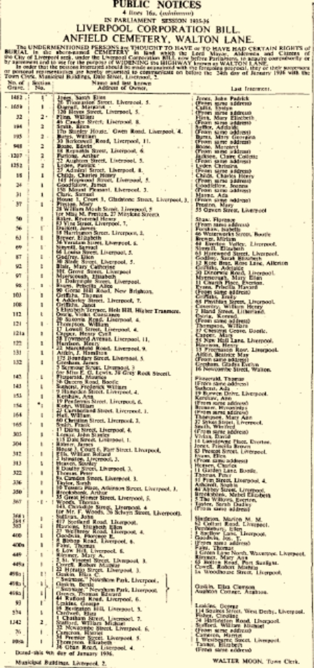 Graves Anfield cemetery acquired compulsorily for widening Walton Lane 1936