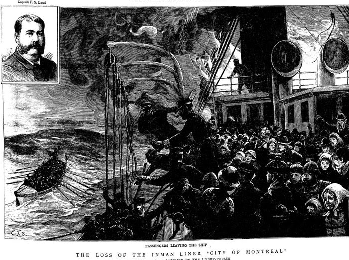 Most of the passengers and crew of the Inman and International Company's steamer the City of Montreal, which burned at sea on the 11th inst in lat 43, long 43, arrived in Liverpool yesterday afternoon. Complete accounts of the catastrophe have already been published. On Saturday at Queenstown, the passengers and crew were transferred to the Cork steamer ST FINBAR, and conveyed to Liverpool. Judging from conversations had with the members of the crew and passengers, few people who have not undergone a similar experience can form an idea of the appalling scenes witnessed on board the burning City of Montreal. Captain LAND the master of the City of Montreal has been singularly unfortunate, for it was he who commanded the City of Brussels, another Atlantic liner, which was sunk by a collision which occurred outside the river Mersey a few years ago during a dense fog. His commanding presence, skill and sea experience served then to prevent great loss of life, and it can only have been implicit confidence which passengers placed in so able a seaman that prevented a panic on the ship. In a blinding smoke and with an uncontrollable destroyable element beneath their feet, there were all the forces which under other conditions would have led to panic. When on Wednesday morning the boats were ordered to be provisioned, the excitement appears to have reached a huge pitch. The boats soon afterwards were lowered and passengers were seen running from one end of the ship to the other seeking a boat that was not full.