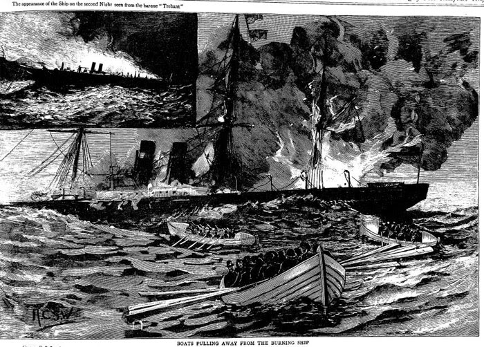 "We left New York on Saturday, 6th inst, with 133 intermediate and steerage passengers on board for Queenstown and Liverpool. No incident worth recording took place, the weather being fine, until Wednesday night, the 10th inst, at 9 o' clock when in lat 43 88 N., long. 53 54 W., the wind being light from north west, fire was discovered in the after main orlop hatch amongst the cotton. Several hose were instantly connected and fire annihilators and hand grenades used freely, and every effort used to extinguish the flames, but they overcame all efforts, and finally spread to such an extent in the upper and lower tween decks that I saw the ship was doomed to destruction. From the commencement of the fire active arrangements were made in preparing the boats and placing provisions in them. At 6am the following morning flames burst out in one of the after hatches, the vessel was then enveloped in long tongues of flame. Boats were quickly lowered notwithstanding that it was a difficult task owing to the high sea running. Woman and children were first put into them, and it was a job, then the passengers and crew afterwards. I may add that the boats were not manned by their respective crews as circumstances did not allow that to be done. The men having to fight down the fire to the last, could not be at their boats. Accordingly as each boat was loaded it left the ship's side and got safely away. By some unfortunate oversight, however about 20 persons were left on board the burning craft. When this was discovered No 3 boat returned and took 6, and No 5 boat also returned and took another 6. Just as this was being done a barque was sighted coming down on us, and on her arriving we found she was the TREBANT of Germany. Soon our boats were alongside, and we safely transferred all to the barque. While this was being done one boat returned to the Montreal and rescued the remaining people from the vessel, which was enveloped in flames. When we got on board the TREBANT we found that one vessel was missing, and soon after was observed running before the wind, and, using her oars for sails she sped away, in direct disobedience to my orders previously given. We lost sight of that boat and have not seen her since. All night we stayed on that barque and next morning were transferred to the Furness Line steamer YORK CITY, bound from Baltimore for London, which had come up during the night. Captain BENN of the YORK CITY made a search for the missing boat, but failed to find her. The smoke and heat affected my eyes, those of the chief officer, and in fact, those of all who were trying to put the fire out, thus rendering us all partially blind for some hours. The chief officer was led, totally blind and in great pain, over the ship's side into the boat and did not get his eye sight for two days after. All behaved admirably well, considering everything had to be done in a dense, blinding smoke. The crew and passengers lost everything. I cannot say what the origin of the fire was, but I'm certain it broke out in several places at the same time".