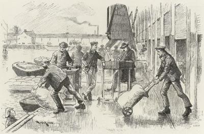 "Working at the Docks" is a comprehensive term. It embraces a large variety of labour, both mental and manual, and no small amount of dexterity and skill. Even a dock labourer to be of any use at all, must have some little training. The mere possession of a "hook" and the physical ability to push or pull a heavy laden truck do not make an accomplished dock labourer. To be an expert in the craft it is necessary that a man should have some knowledge of the nature and properties as well as the outward appearance of the thousand-and-one articles of produce discharged daily from ships of every clime in the world, and not only this but he must be able to "weigh", "lot", "mark", "select", "stow", "sample", and "trim" every package coming under his hands and know how to "bushel" and carry grain into the bargain. Should he aspire to the higher branch of his profession, and become a "stevedore" or "lumper" at 5s a day, he must know how to load a ship, to nicely discriminate the relative weight, size, fragility, and composition of every conceivable commodity, so as to stow them safely and economically in the ship's hold, with due regard to the fact that gunpowder and lucifer matches are ugly neighbours, that pig iron is a heavy nightmare upon Manchester fine goods, and Irish whisky or paraffin oil undesirable in the neighbourhood of the coal bunkers.