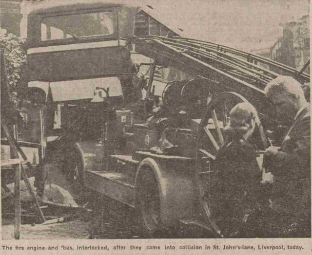 Several people were injured when a fire engine from Hatton Garden going along St Johns Lane, Liverpool in answer to a call swerved to avoid a pedestrian and crashed into the rear of a double decker bus, stationary at the terminus.
