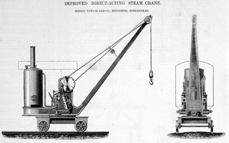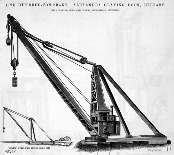 Mr. Taylor's background was in steam quarry cranes of the fixed pole type made in Scotland circa 1839, perhaps the first ever of the type. He then build winch-based cranes on quays from about 1842. It is believed he moved to Birkenhead about 1850. In December 1853 he filed an important patent - No. 3004 for - "Certain improvements in raising and lowering weights".