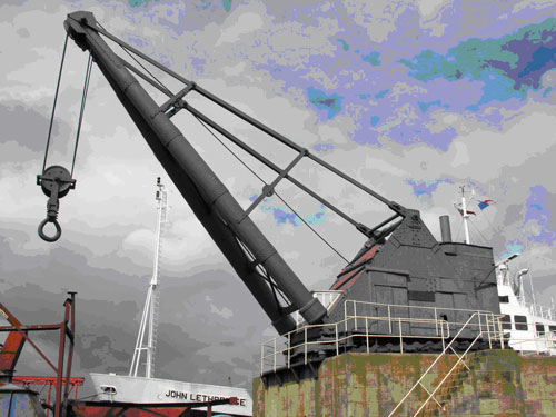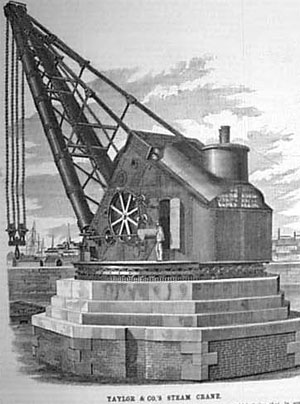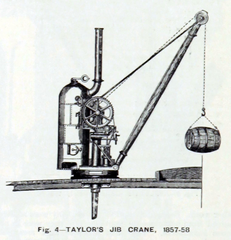 From 1869 to about 1885 he made the large fixed slewing cranes which provided the only heavy-lifting power at main ports from Britain to Australia, Japan and Peru. Among features first used by him in large steam cranes were the full-circle, three-part, live slewing race, and the rolled, tapered and riveted jib - the exact means of constructing same at the time remains a mystery today. About 1887 Taylor's substantial and important firm at Birkenhead literally disappeared overnight. Unfortunately for the Industrial Historian, remnant archives amount to almost zero.