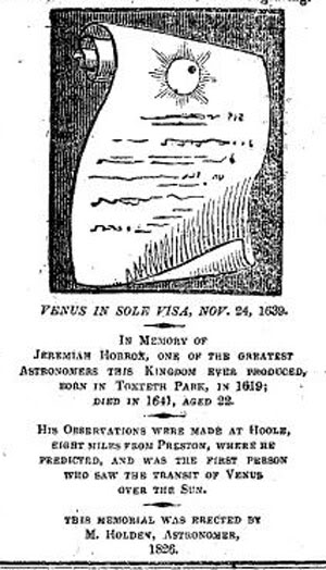 The Rev R. BRICKEL, rector of Hoole, is anxious to erect in his parish church some memorial of Jeremiah HORROX, who, when discharging the duties of minister of that parish in the year 1639, was the first person to observe a transit of Venus over the sun. Towards this object he is now appealing to astronomers and others who take an interest in scientific pursuits throughout the country. It is not as yet decided what form the memorial will take, but it has been suggested that a clock be placed in the tower of the venerable church. There is reason to believe that the sun dial which is so prominent an object in the old tower was placed there by HORROX. We may add that about 30 years ago, a monument was erected through the instrumentality of our townsman Mr Moses HOLDEN, in the church of St Michael at Toxteth Park, near Liverpool, to the memory of HORROX, he having been born in Toxteth. Mr HOLDEN feeling that there ought to be some memorial of the young astronomer, who had done so much for his favourite science, delivered a lecture in Liverpool in aid of the object of erecting a monument to him, and with the proceeds the monument in Toxteth Church was placed there. As HOOLE was the scene of HORROX'S observations and of his ministry, we doubt not that Mr BICKEL'S object of having a memorial of him there will meet with general support.