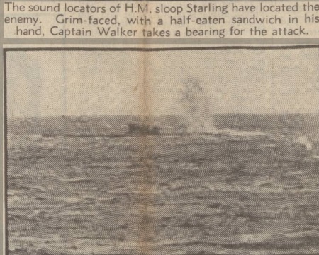 Captain F. J. Walker. One of the "kills" is shown in the dramatic pictures below. The sound locators of H.M. sloop Starling have located the enemy. Grim-faced, with a half-eaten sandwich in his hand, Captain Walker takes a bearing for the attack