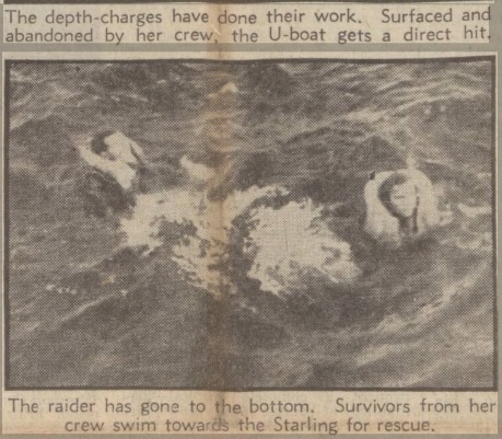 Shortly after Starling fired her last depth charge the U-boat surfaced nearly a mile away. Starling at once engaged with gunfire, scoring hits with both her inch and smaller armament. The U-boats crew quickly abandoned ship and eight minutes after surfacing the enemy sank stern first. The entire crew of 51 were picked up and made prisoners of war.