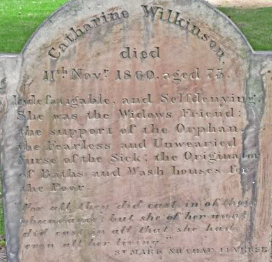 At the opening of the new baths at Everton in June 1863, Mr WAGSTAFF refers to the great success of the baths since their first establishment in Liverpool. At that time, he says, Liverpool was suffering under a dire visitation of the cholera and they and the washhouses originated mainly with a poor woman named Catherine WILKINSON in 1832. He had witnessed from his own window people sinking down from cholera at door steps and public house doors. Catherine WILKINSON having a large cellar and large sized boiler, cleansed the things of the poor people at the lowest possible charge, with that interest in the welfare of the labouring classes, seeing the good effect of this woman’s labour, he took a warm interest in the matter, from small beginnings great results followed and led to the establishment of public baths in Liverpool, and had given tone and impetus to the whole kingdom. Subsequently the Paul St and Cornwallis St baths were established and now the Everton Baths had been that day opened for the benefit of the public, he was sure would be of the greatest good to the community.