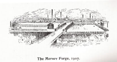 The great Mersey Forge is a credit to Liverpool. These celebrated works are situated immediately by the river whence they derive their name, in a portion of the ground that originally formed the royal demesne of Toxteth Park and have a part of the Harrington Dock and some of the long timber quays in front. The situation is one of the greatest advantage, as to the rear there is a high level roadway by which materials can be conveyed without going all around the body of the concern, whilst directly in front is the low level of the public quay or Sefton St.