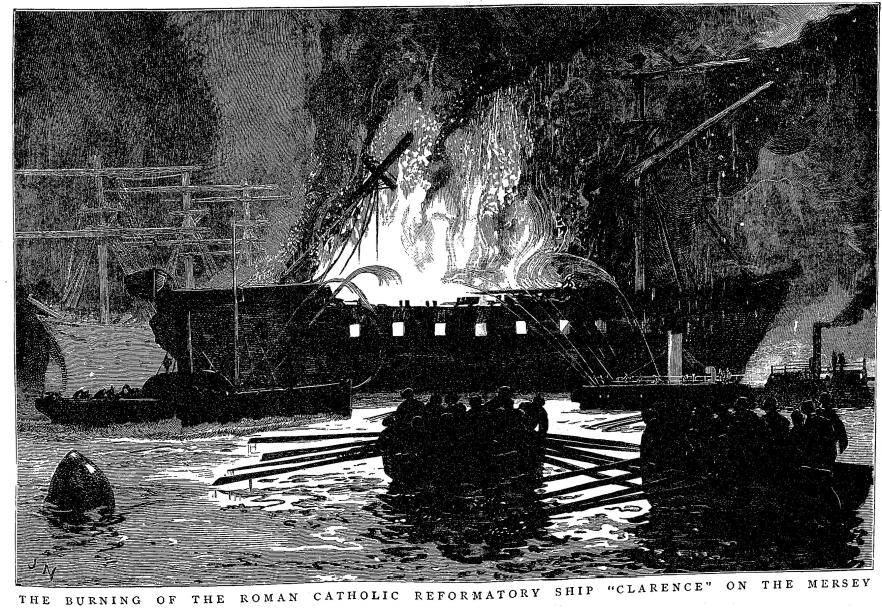 For some time past considerable insubordination has been shown on the CLARENCE, at the last Liverpool Assizes, the trial of one of the boys for stabbing a petty officer showed indications that some mischief was brewing among the lads. The feeling became so strong that on Saturday last a request was made to Messers THOMPSON and GOUGH, lessees of Eastham Ferry, to permit one of their steamers to stand by the CLARENCE, in consequence of this the Eastham Fairy, Captain ASHWORTH, remained alongside the whole of the night. Nothing occurred then and everything was supposed to be alright, but about 2pm yesterday smoke was observed issuing from the CLARENCE. Mr THOMPSON who was on the New Ferry pier at once despatched the steamer Eastham Fairy to the CLARENCE. In the meantime the steamer got her hoses ready and began to play them on the flames. Whilst that was going on the boys and moveable goods from the cabins were transferred from the CLARENCE. Shortly afterwards the Fairy Queen another vessel belonging to Messers THOMPSON and GOUGH, under the command of Captain HUBBARD, got alongside and seeing that the fire was assuming larger proportions, the captain steered his vessel to the Georges Landing stage to procure the Underwriters Associations steam pumps, which would be sent on immediately. The Fairy Queen returned to the CLARENCE and received on board all the boys, transferring them to the Gipsy Queen another vessel of the fleet of Messers THOMPSON and GOUGH, where they remained for the night. A great quantity of paraffin was stored on the vessel used for lighting the ship, this was secured and taken to the Eastham Ferry. Those endeavouring to quell the flames had considerable difficulty as dense smoke pervaded the vessel, no doubt caused by the fact that she was an old vessel, and a large quantity of oakum had been used in her caulking.