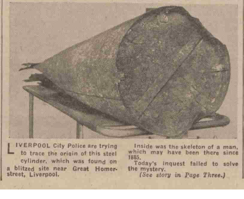 Children who found a skeleton inside a large steel cylinder on a blitzed site near Great Homer St, Everton, have discovered a mystery which may date back to 1885.